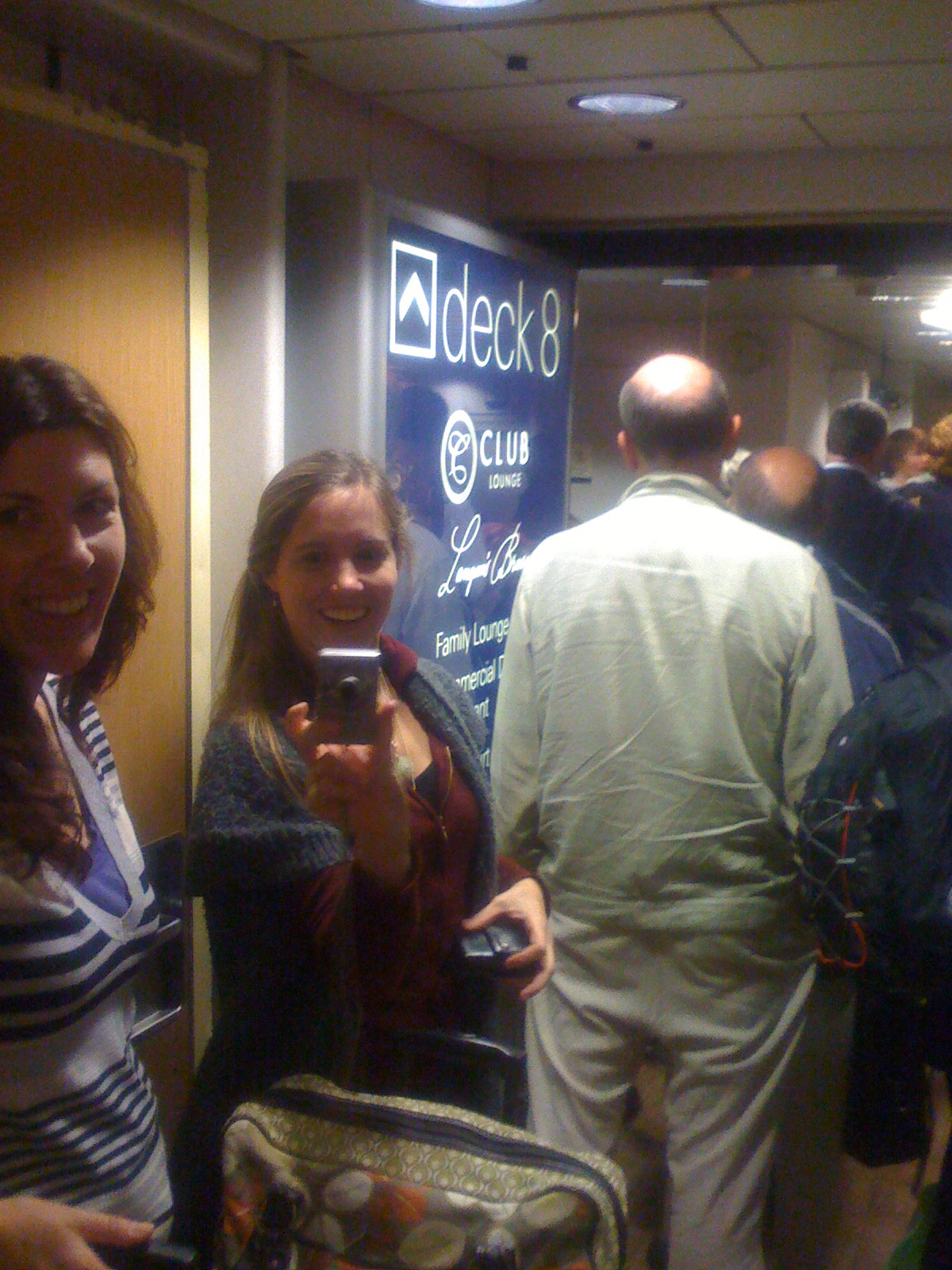 Max was doing fine up until this point which was about 4-5 hours into the trip. We were frantic to get on the ferry which we heard was leaving at 8:00. Finally a woman who noticed that Max was starting to wear thin (he was starting to cry and fuss) mentioned to Jennifer if this was a normal station they would let the baby go first and that Jen should go to the front of the “mob”. Thankfully Jennifer did and we received our tickets, but then we had to go through the security checkpoint which we had already done in Paris and then go through a british passport check! You would think that we would be getting on the ferry right away, but no! We had to take a bus to the ferry dock. The ferry was a welcome sight with it’s relaxed air. Max was able to finally get out of his carrier and run around and made friends with little girl from Singapore. They had a lot of fun!